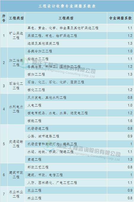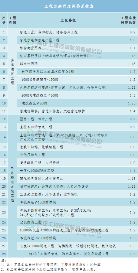 工程復雜程度調整系數:0.8~1.2(工程復雜程度具體調整系數由工程咨詢機構與委托單位根據各類工程情況協商確定)。