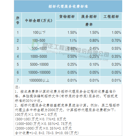 招標代理服務取費可參考《國家計委關于印發<招標代理服務收費管理暫行辦法>的通知》(計價格〔2002〕1980號),采用差額定率累進計費方式。