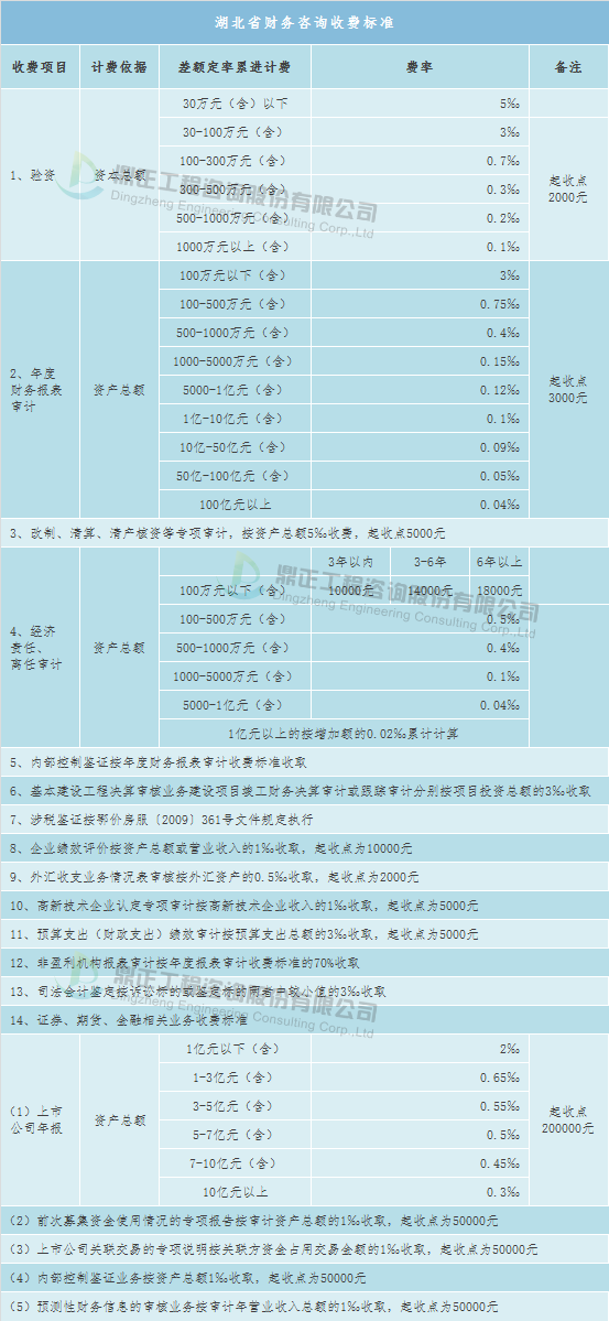 會計師事務所服務可參考地方收費標準,如湖北省地方標準——《湖北省物價局省財政廳關于印發<湖北省會計師事務所服務收費管理實施辦法>的通知》(鄂價規〔2010〕265號),具體如下: